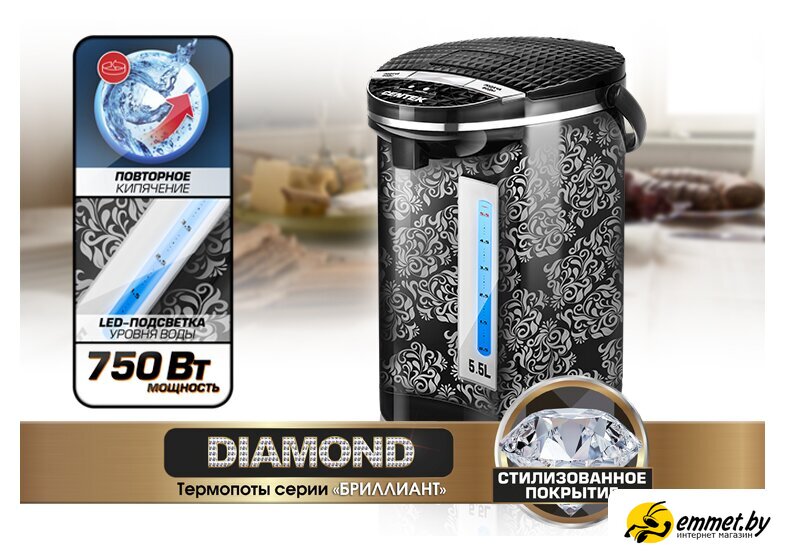 термопот, 750 Вт, объем 5.5 л, подсветка, цвет черный. Профессиональная консультация! Доброжелательные и тактичные курьеры, ответят на все интересующие вопросы! Доставка бесплатная, исключениями являются доставка крупногабаритного груза и доставка по регионам! Возможен самовывоз!