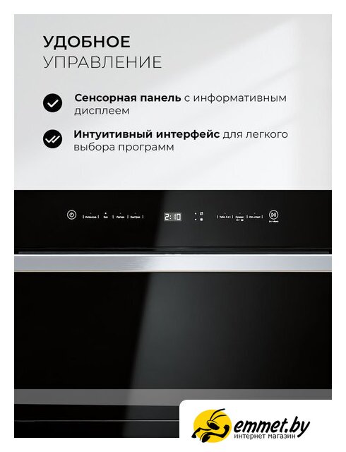 загрузка на 6 комплектов посуды, сенсорное управление, 4 программы, 56x50x46.5 см, черный цвет, сушка: стандартная (конденсация), индикация на полу: нет