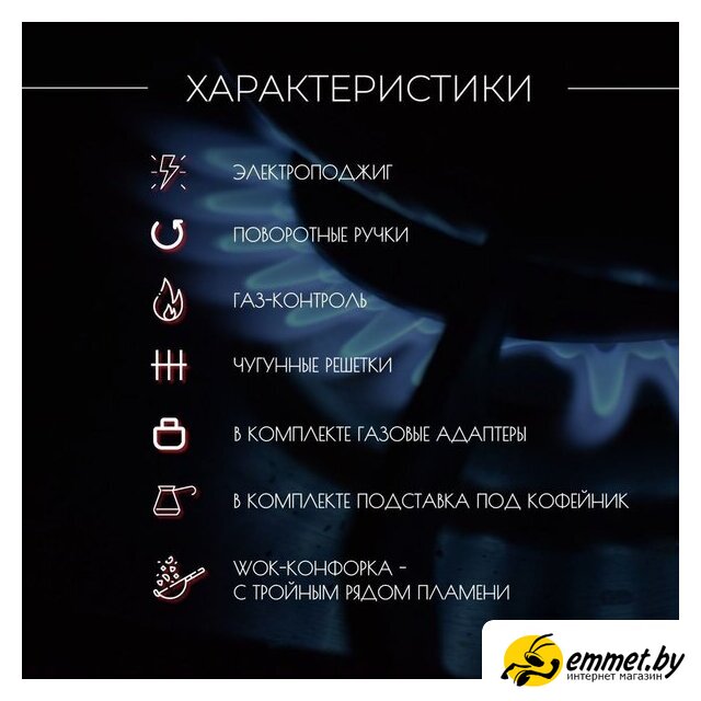 газовая на 4 конфорки, эмалированная сталь, мощность: 8100 Вт, автоматический электроподжиг, газ-контроль, решетки: чугун, независимая установка, размеры (ШхГ): 58x51 см. Профессиональная консультация! Доброжелательные и тактичные курьеры, ответят на все интересующие вопросы! Доставка бесплатная, исключениями являются доставка крупногабаритного груза и доставка по регионам! Возможен самовывоз!