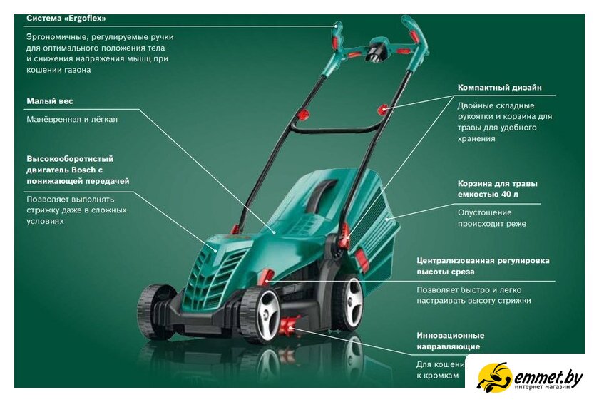 роторная газонокосилка, электрический двигатель, 1300 Вт, 1.76 л.с., ширина скашивания: 34 см, жесткий травосборник 40 л. Профессиональная консультация! Доброжелательные и тактичные курьеры, ответят на все интересующие вопросы! Доставка бесплатная, исключениями являются доставка крупногабаритного груза и доставка по регионам! Возможен самовывоз!