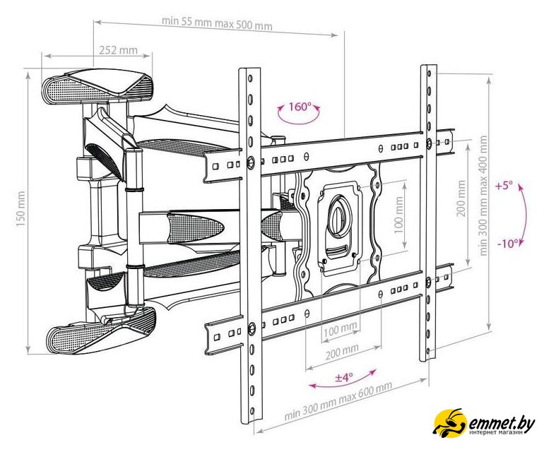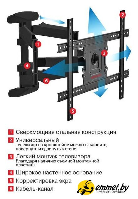 настенный кронштейн для ЖК-монитора 32-65", наклон 5°, поворот 160°, цвет черный