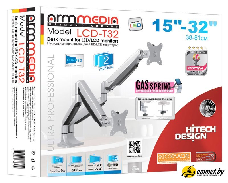 настенный/настольный кронштейн для ЖК-монитора 15-32", наклон 90°, поворот 270°, цвет серебристый. Профессиональная консультация! Доброжелательные и тактичные курьеры, ответят на все интересующие вопросы! Доставка бесплатная, исключениями являются доставка крупногабаритного груза и доставка по регионам! Возможен самовывоз!