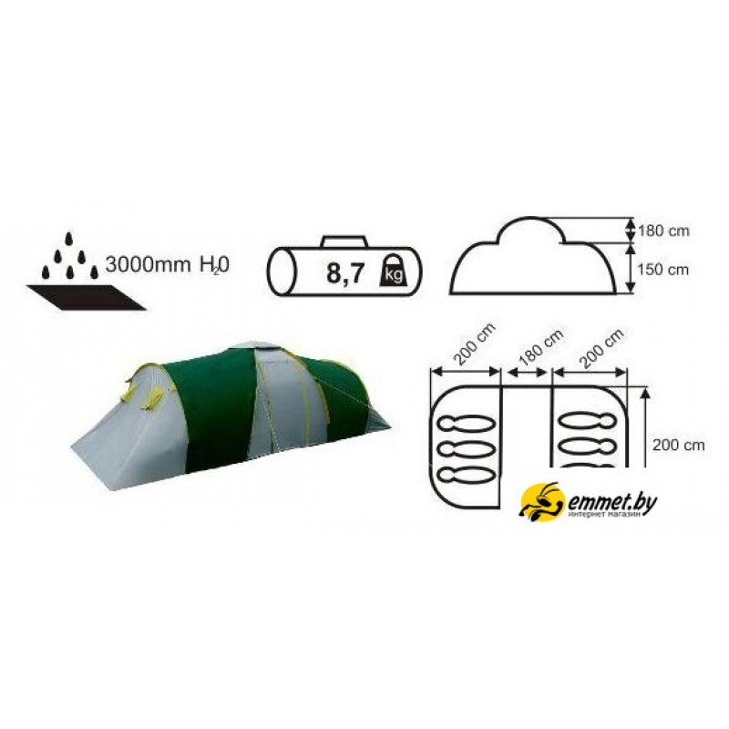 кемпинговая, весна/лето/осень, 6-местная, 2 входа, 3 комнаты, противомоскитная сетка, тамбур, штормовые оттяжки, ДхШхВ: 580x200x180 см