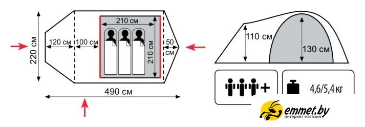 треккинговая, весна/лето/осень, 3-местная, 2 входа, 1 комната, противомоскитная сетка, тамбур, штормовые оттяжки