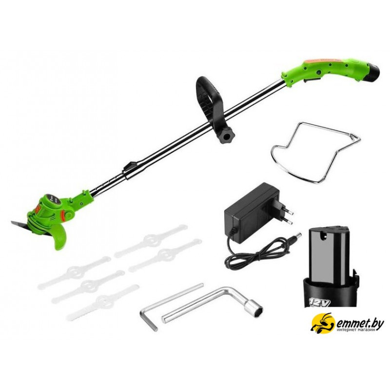 аккумуляторный, 300 Вт, оснастка: металлический нож+пластиковый нож, ширина скашивания 14 см, вес 1.6 кг