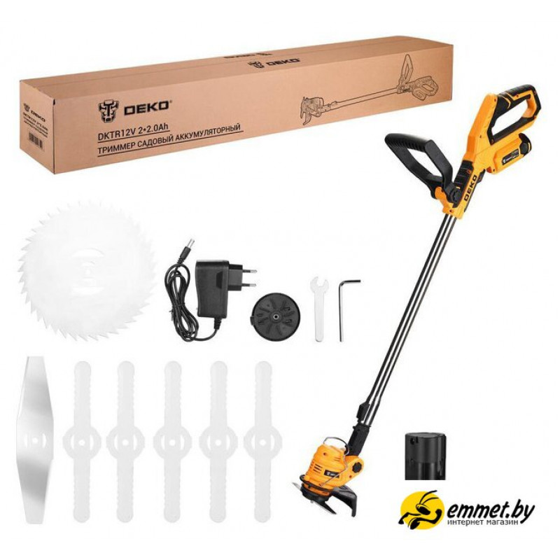 аккумуляторный, оснастка: леска+металлический диск+пластиковый нож, ширина скашивания: 15 см, 12 В, аккумулятор в комплекте, 2.2 кг