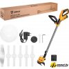 аккумуляторный, оснастка: леска+металлический диск+пластиковый нож, ширина скашивания: 15 см, 12 В, аккумулятор в комплекте, 2.2 кг