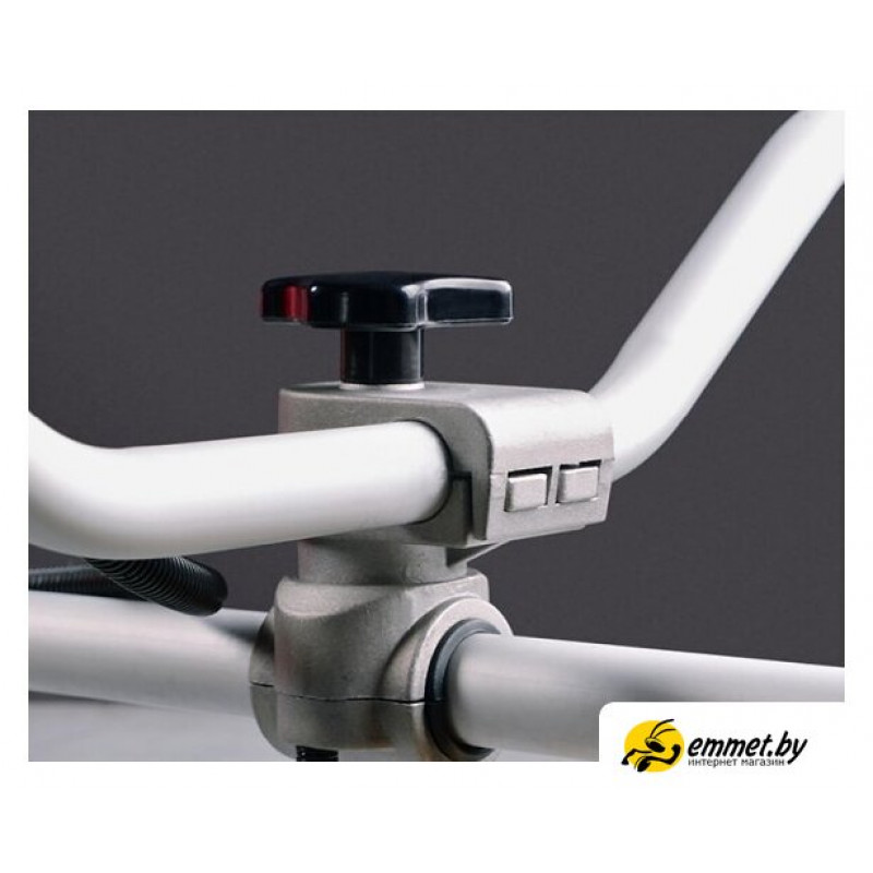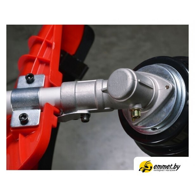 Аксессуары -моторный блок- штанга- полуавтоматическая шпуля с леской (посадка М10х1,25 мм)- стальной триммерный трехлопастный нож- ремень наплечный- рукоятка велосипедного типа- защитный кожух- набор инструментов- канистра для бензосмеси- очки защитные- инструкция по эксплуатации