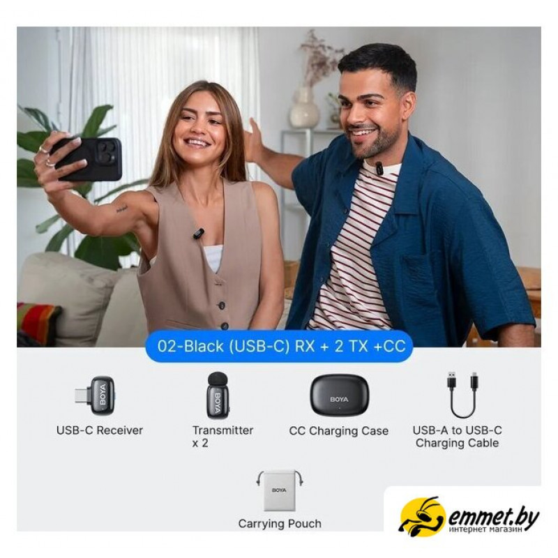| Комплект поставки | - 2 передатчика, - приемник (USB-C), - зарядный кейс, - кабель USB-A - USB-C для зарядки, - сумка для переноски, - стандартная поролоновая ветрозащита |