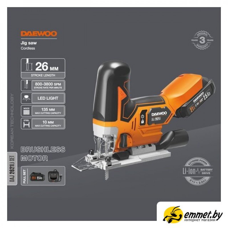 грибообразная рукоятка, питание: аккумуляторный (21 В), аккумулятор в комплекте, глубина пропила: 135 мм (дерево), 10 мм (сталь), 800–3800 ходов/мин, ход пилки: 26 мм, 2.18 кг