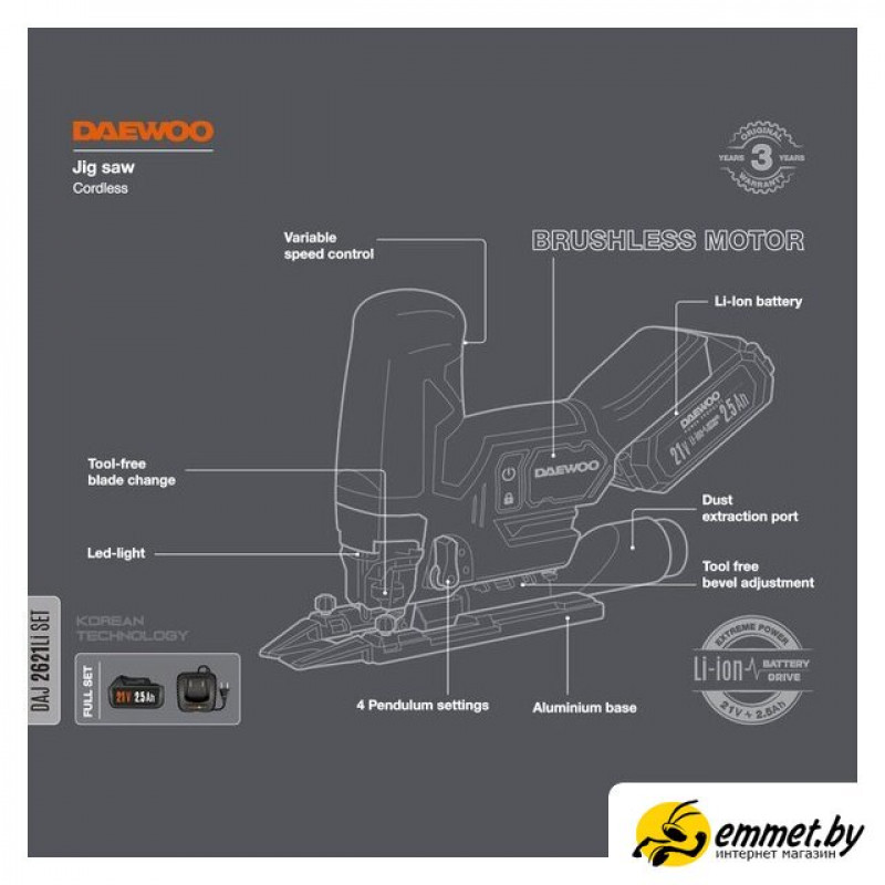 | Комплект поставки | - Лобзик - 1 шт.- Аккумулятор 2,0 Ач - 1 шт.- Зарядное устройство - 1 шт.- Пильное полотно -1 шт .- Адаптер для пылесоса 1 шт.- Параллельный упор - 1 шт.- Защитные крышки - направляющие - 1 компл.- Руководство по эксплуатации - 1 шт.- Коробка |