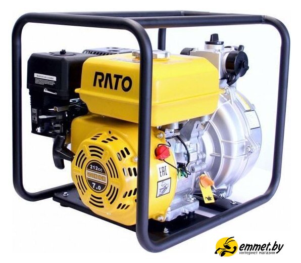 для слабозагрязненной воды, бензиновый двигатель Rato R210, мощность 4.41 кВт, производительность 267 л/мин, высота подъема 80 м, бак 3.1 л, патрубки 50/50 мм