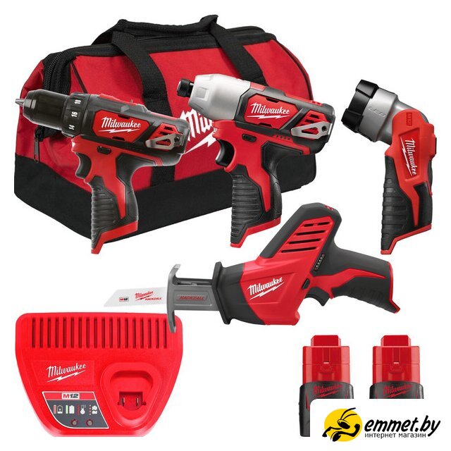 Наборы электроинструментов Milwaukee M12 M12BPP4A-202B 4933441240 (шуруповерт, винтоверт, фонарик, сабельная пила, 2 АКБ, сумка)