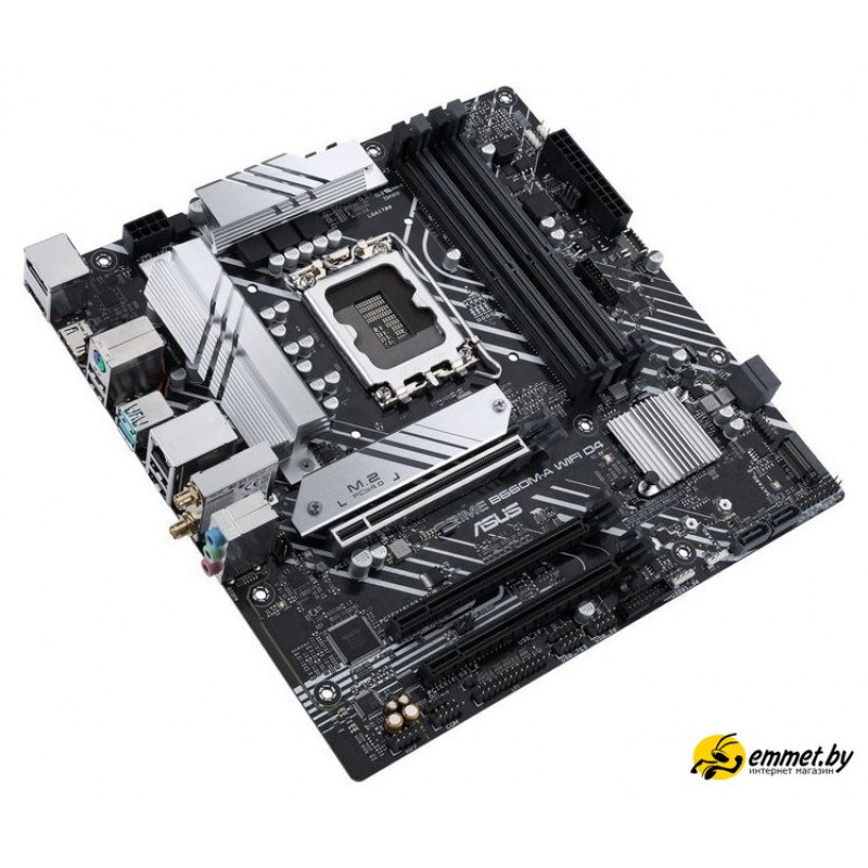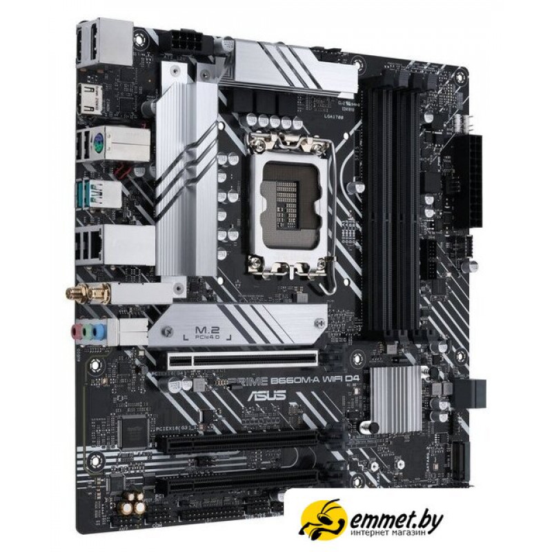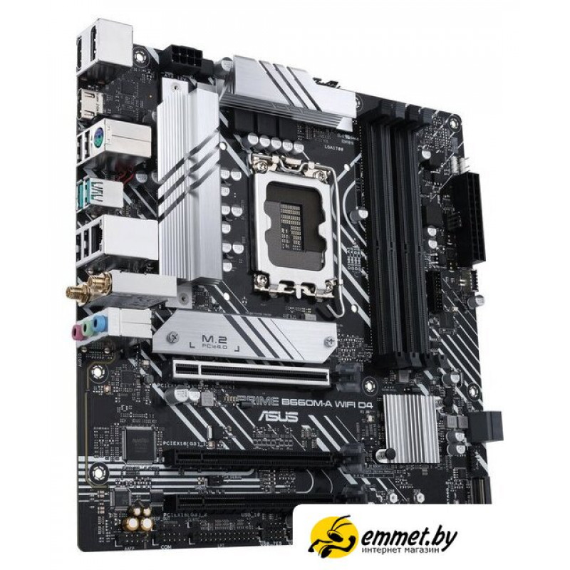 mATX, сокет Intel LGA1700, чипсет Intel B660, память 4xDDR4 до 5333 МГц, слоты: 3xPCIe x16 4.0, 2xM.2, 802.11ax (Wi-Fi 6)+Bluetooth 5.2