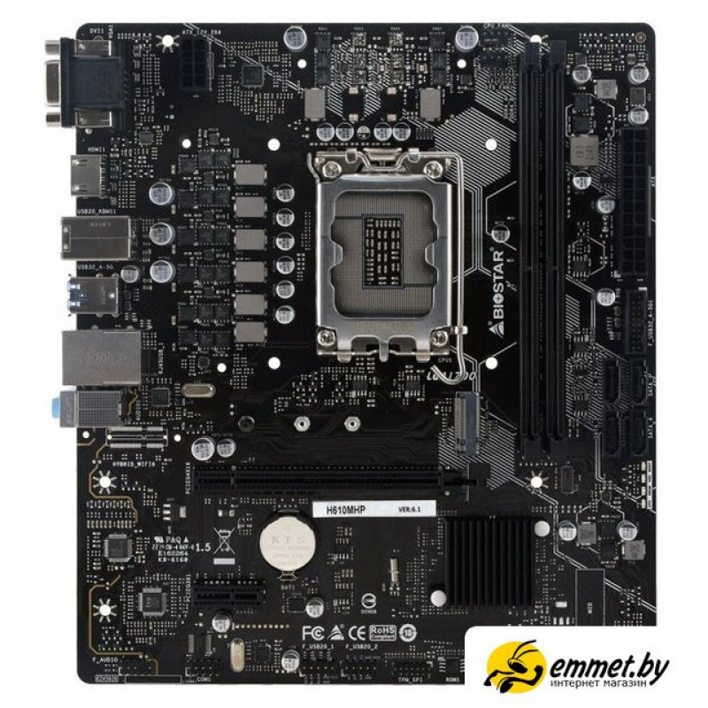 mATX, сокет Intel LGA1700, чипсет Intel H610, память 2xDDR4 до 3200 МГц, слоты: 1xPCIe x16 4.0, 1xPCIe x1, 1xM.2