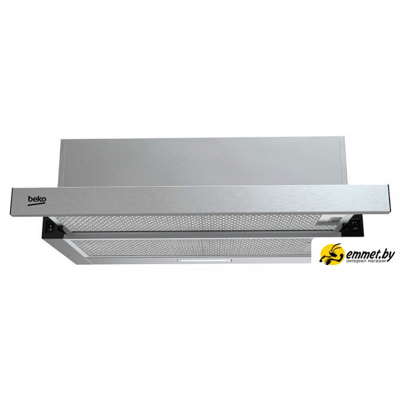 конструкция телескопическая, монтаж для встраивания, ширина 59.8 см, управление механическое/кнопочное, производительность мотора 320 м³/ч, цвет нержавеющая сталь
