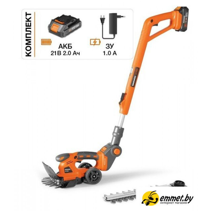 | Комплектация | - Ножницы-кусторез -1 шт.- Нож для кустарников -1 шт.- Нож для газона -1 шт.- Защитный щиток - 1 шт.- Ковш для травы - 1 шт.- Колеса для перемещения - 1 шт.- Рукоятка телескопическая - 1 шт.- Зарядное устройство -1 шт.- Аккумуляторная батарея 2,0 Ач - 1 шт.- Руководство по эксплуатации.- Коробка. |