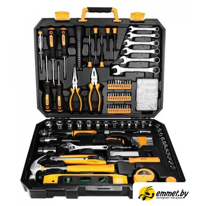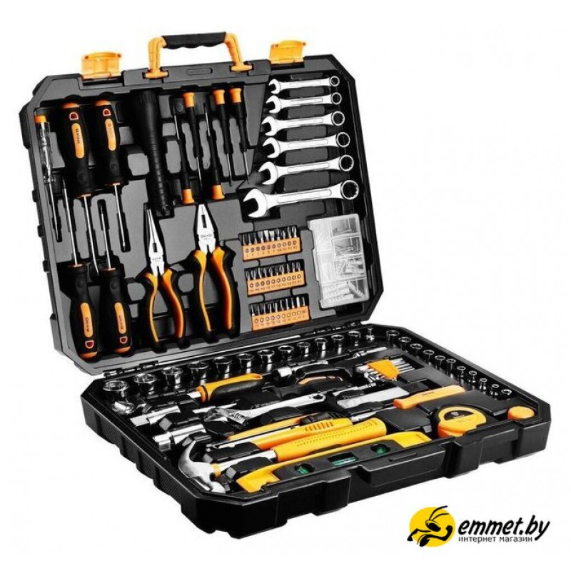 Комплектация Отвертка индикаторная 100-220ВОтвертки PH1х75; PH2х100; SL5х75; SL6х100 ммФонарикДлинногубцы 6Плоскогубцы 6Отвертки PH000; PH00; PH0; SL2.4; SL3.0Биты SL3; SL4; SL5; SL6; SL6; SL7Биты PH0; PH1; PH2; PH2; PH2; PH3; PH3Биты PZ0; PZ1; PZ2; PZ2; PZ2; PZ3; PZ3Биты H3; H4; H5; H6; T10; T15; T20; T25; T30; ADКлючи 8; 10; 12; 13; 14; 17ммДержатель головок 1/4Адаптер 1/4x3/81/4 головки 4; 5; 6; 7; 8; 9; 10; 11; 12; 13 мм3/8 головки 10; 11; 12; 13; 14; 15; 16; 17; 19; 20; 21; 22 мм3/8 Головки свечные 16 мм; 21 ммУдлинитель 3/8х3Карданный шарнир 3/8Трещотка 3/8Отвертка-держатель 1/4Ключ шестигранный 1,5; 2; 2,5; 3; 4; 5; 5,5; 6 ммОтвертка-держатель 6,35 ммКлюч разводной 6Набор лезвий для ножа строительного (10 шт.)Нож строительный 18 ммМолоток 8Уровень 9Рулетка 3 мМагнитный держатель для бит 1/4Комплект крепежа по дереву 104 шт.Отвертки прецизионные PH0, PH00, PH000; SL2.4, 3.0Насадка на молотокКомбинированные ключи 8, 10, 12, 13, 14, 17 ммКейс
