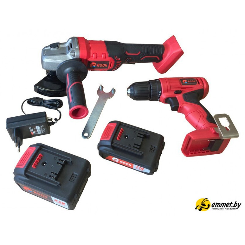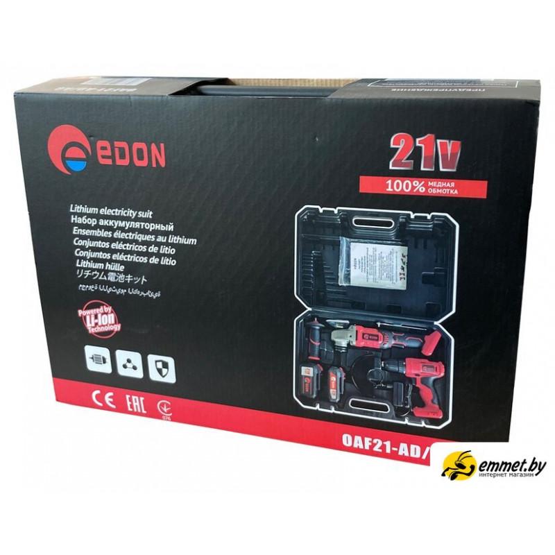 | Комплектация | 1. УШМ Edon OAF21-AG - 1 шт.2. Дрель-шуруповерт Edon OAF21-AD - 1 шт.3. Аккумулятор литий-ионный Edon LIO/OAF-3,0Ah - 1 шт.4. Аккумулятор литий-ионный Edon LIO/OAF-2,0Ah - 1 шт.5. Зарядное устройство Edon OAF21-1100CB - 1 шт.6. Боковая ручка ушм - 1 шт.7. Ключ для замены диска - 1 шт.8. Поясное крепление (крючок) - 1 шт.9. Паспорт-инструкция - 1 шт.10. Пластиковый кейс - 1 шт. |