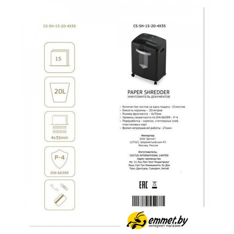 офисный, 4-й уровень секретности, кратковременный режим работы, 70 дБ, корзина: 20 л