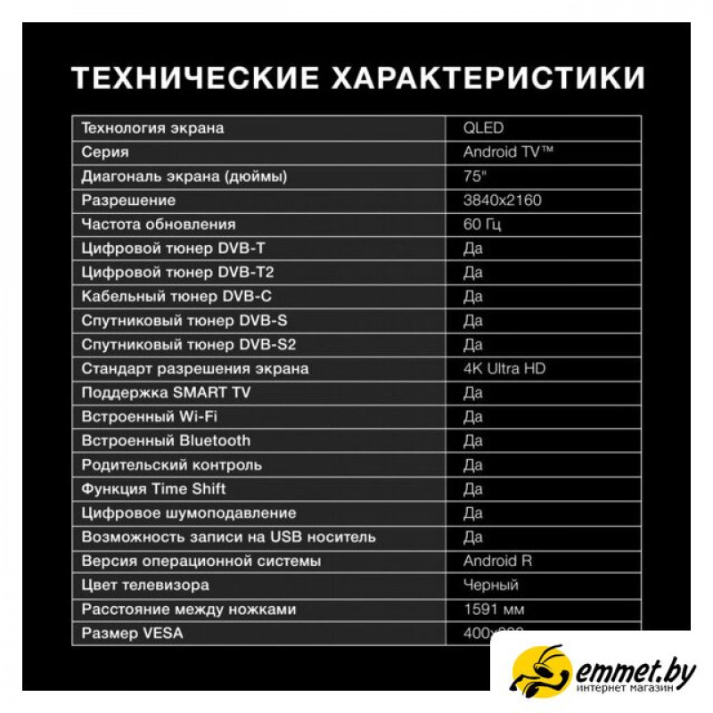 75" 3840x2160 (4K UHD), матрица VA, частота матрицы 60 Гц, Smart TV (Android TV), HDR10, HLG, Wi-Fi, смарт пульт