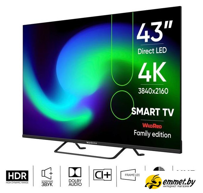 43" 3840x2160 (4K UHD), экстерьерный, матрица VA, частота матрицы 60 Гц, Smart TV (Wildred), HDR, Wi-Fi. СТБ! Официальная гарантия. Возможна доставка "сегодня на сегодня". По Минску есть услуга "Монтаж на стену" - платно. Доставка по Минску и Беларуси. Возможен самовывоз! Профессиональная консультация и помощь в выборе! Наши менеджеры ответят на интересующие вопросы. Пунктуальные и тактичные курьеры.
