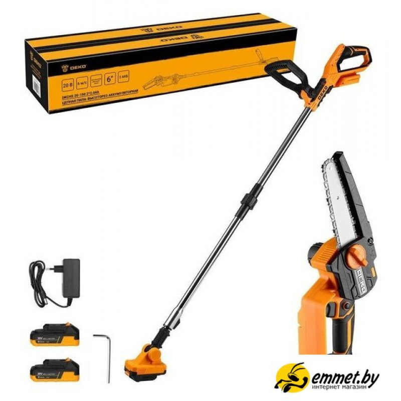 | Комплектация | - Пила (основной корпус) - 1 шт.- Телескопическая штанга с рукояткой - 1 шт.- Аккумулятор 2,0 Ач - 2 шт.- Зарядное устройство - 1 шт.- Шина - 1 шт.- Цепь - 1 шт.- Защитный щиток - 1 шт.- Шестигранный ключ - 1 шт.- Руководство по эксплуатации- Коробка |